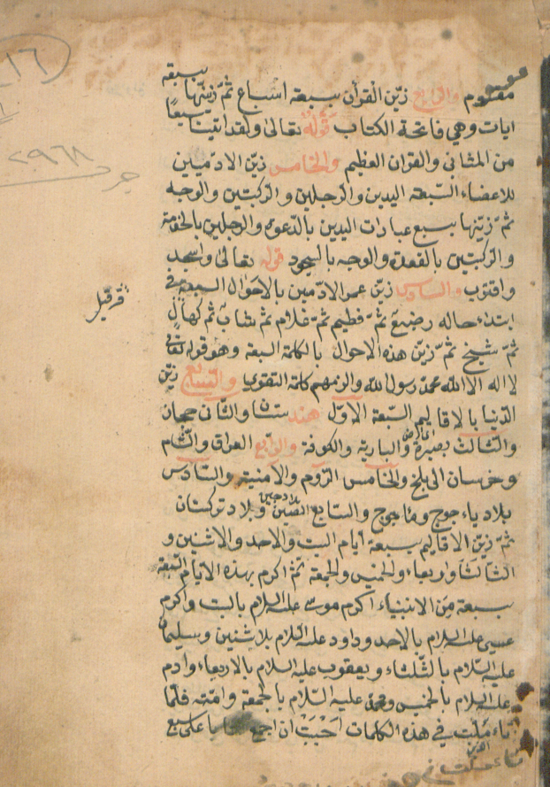 اوله ناقص : والرابع زين القران بسبعة اسباع ثم زينها بسبعة ايات وهي فاتحة الكتاب. قوله تعالى ولقد اتينا سبعًا من المثاني والقران العظيم...