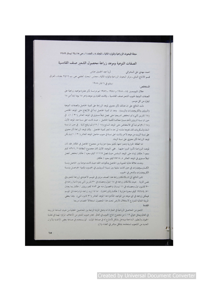 الصفات النوعية وموعد محصول الشعير صنف القادسية /