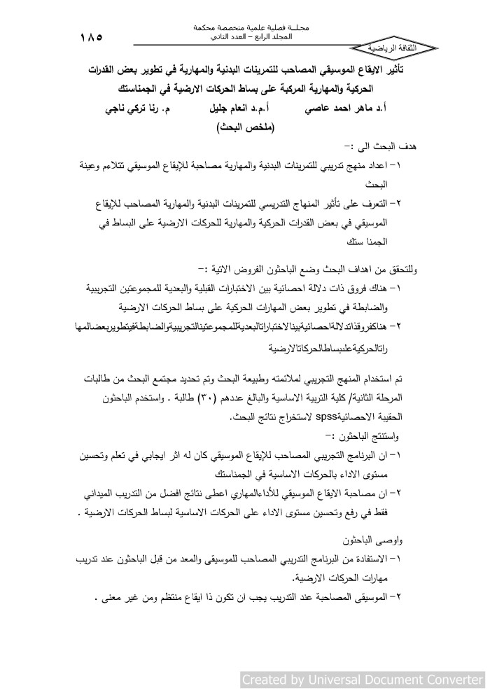$aتأثير الايقاع الموسيقي المصاحب للتمرينات البدنية والمهارية في تطوير بعض القدرات الحركية والمهارية المركبة على بساط الحركات الارضية في الجمناستك = $bThe Impact of Musical Melody Which is accompanied by physical skill Exercises in Developing the Dynamic Capacities on Gymnastic Court / $cأ. د. ماهر احمد عاصي، أ. م. د. انعام جليل، م. رنا تركي ناجي.