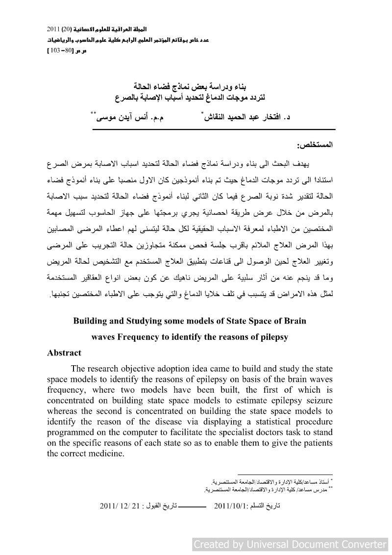 $aبناء ودراسة بعض نماذج فضاء الحالة لتردد موجات الدماغ لتحديد أسباب الإصابة بالصرع = $bBuilding and Studying some models of State Space of Brain waves Frequency to identify the reasons of pilepsy / $cد. افتخار عبد الحميد النقاش، م.م. أنس آيدن موسى.