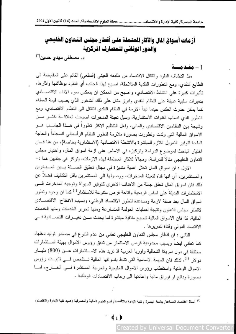 $aأزمات أسواق المال والآثار المحتملة على أقطار مجلس التعاون الخليجي والدور الوقائي للمصارف المركزية / $cد. مصطفى مهدي حسين.