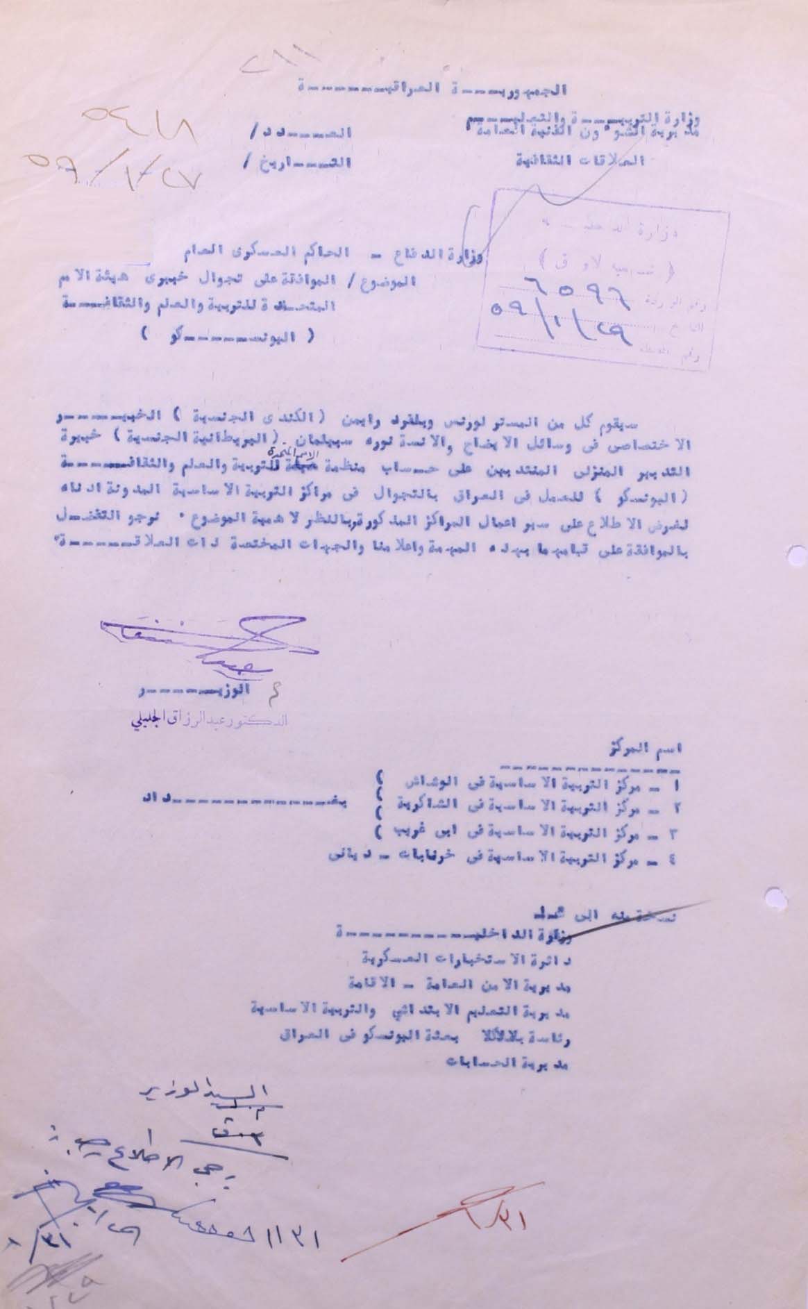 $aتجوال المستر لورنس وبلفرد راسمن الكندي الجنسية والخبير الاختصاص في وسائل التيضاح والاسة سبيلمان البرطانية الجنسية وخبيرة التدبير المنزلي المندبين علي حساب منظمة الامم المتحدة للتربية والعلم والثقافة (اليونسكو) للعمل في العراق في مراكز التربية الاساسية لغرض الاطلاع على سبل اعمال المراكز.