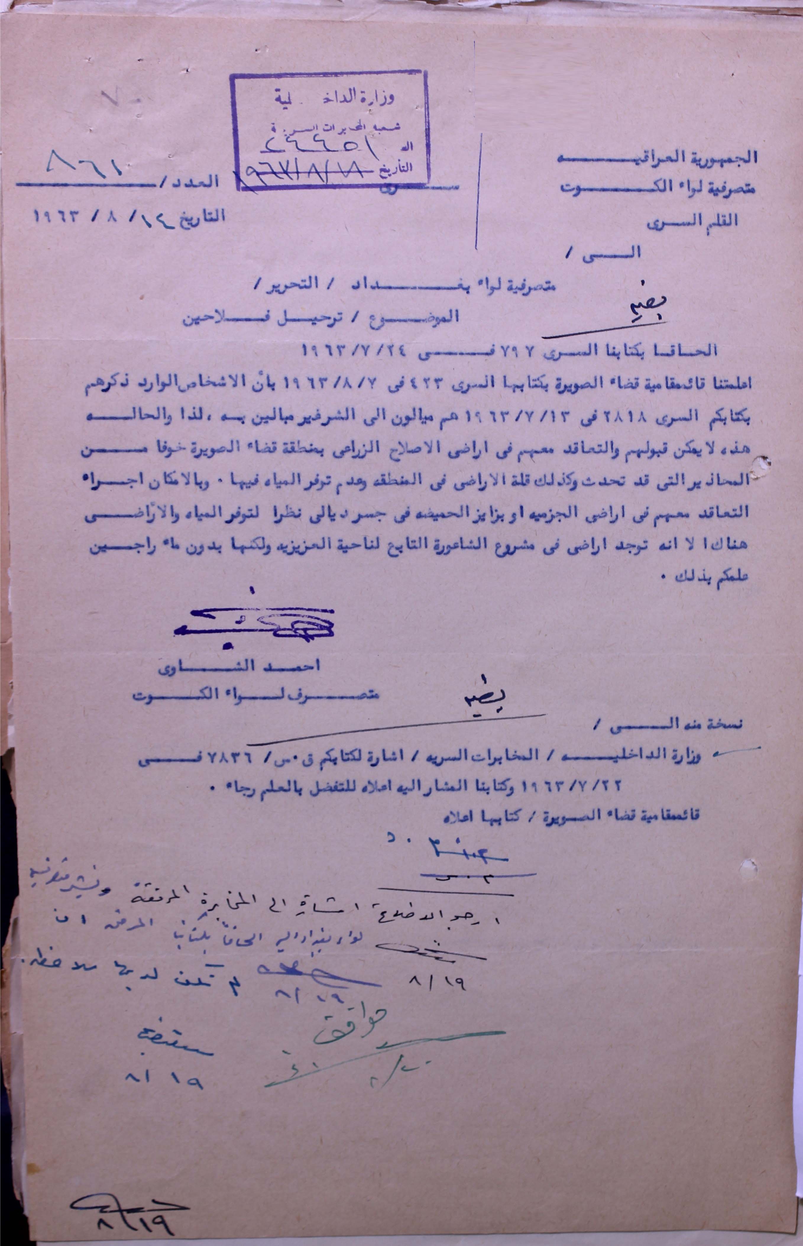 $aلايمكن التعاقد مع الفلاحين للاراضي الاصلاح الزراعي بمنطقى قضاء الصويرة خون من شحت المياه وقلة الراضي ويمكن التعاقد معهم في اراضي الجزمية او بزايز الحمضية في جسر ديالى لتوفي المياه.