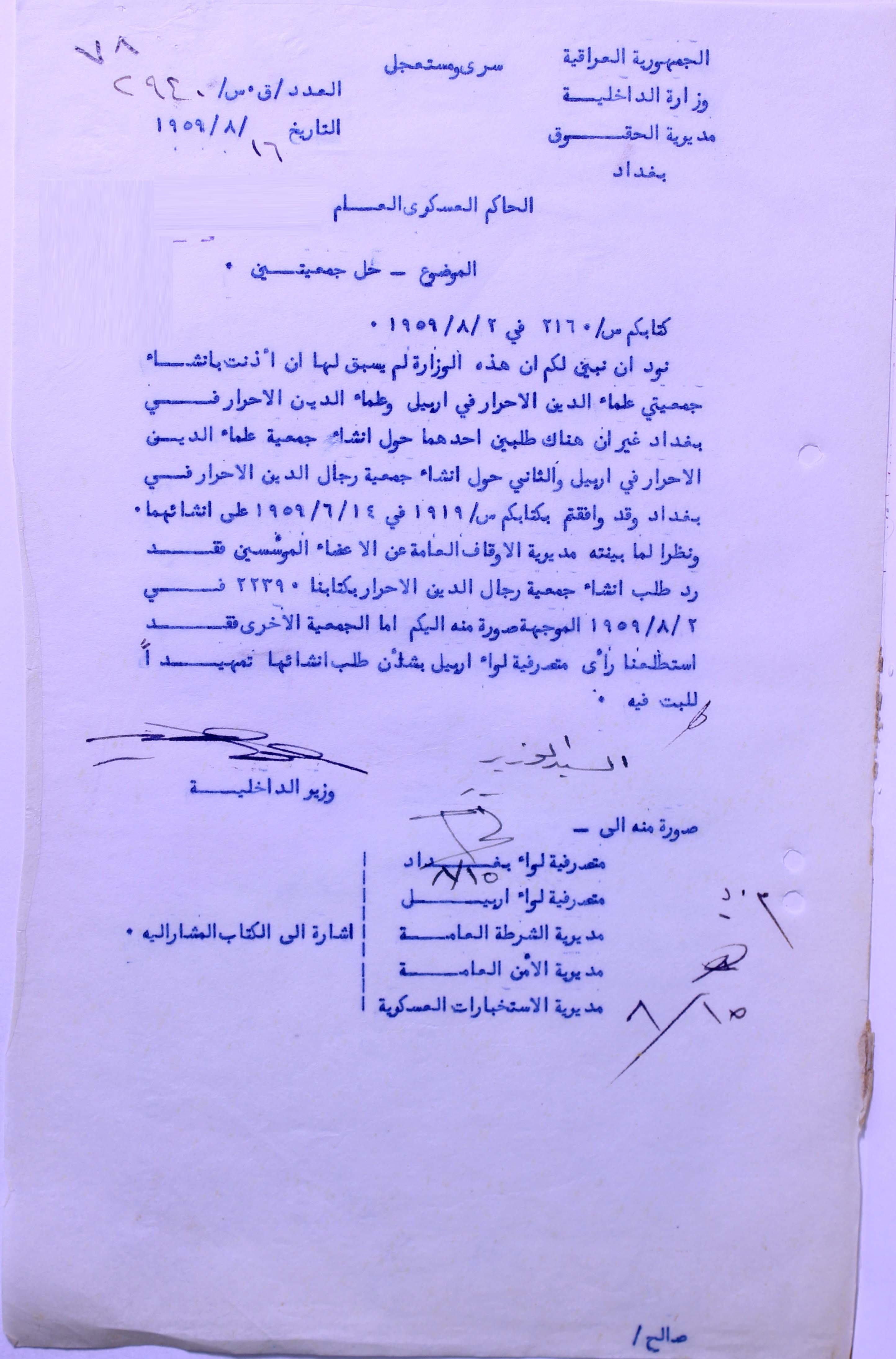 حل جمعيتي جمعية علماء الدين الاحرار في اربيل وجمعية علماء الدين الاحرار في بغداد.