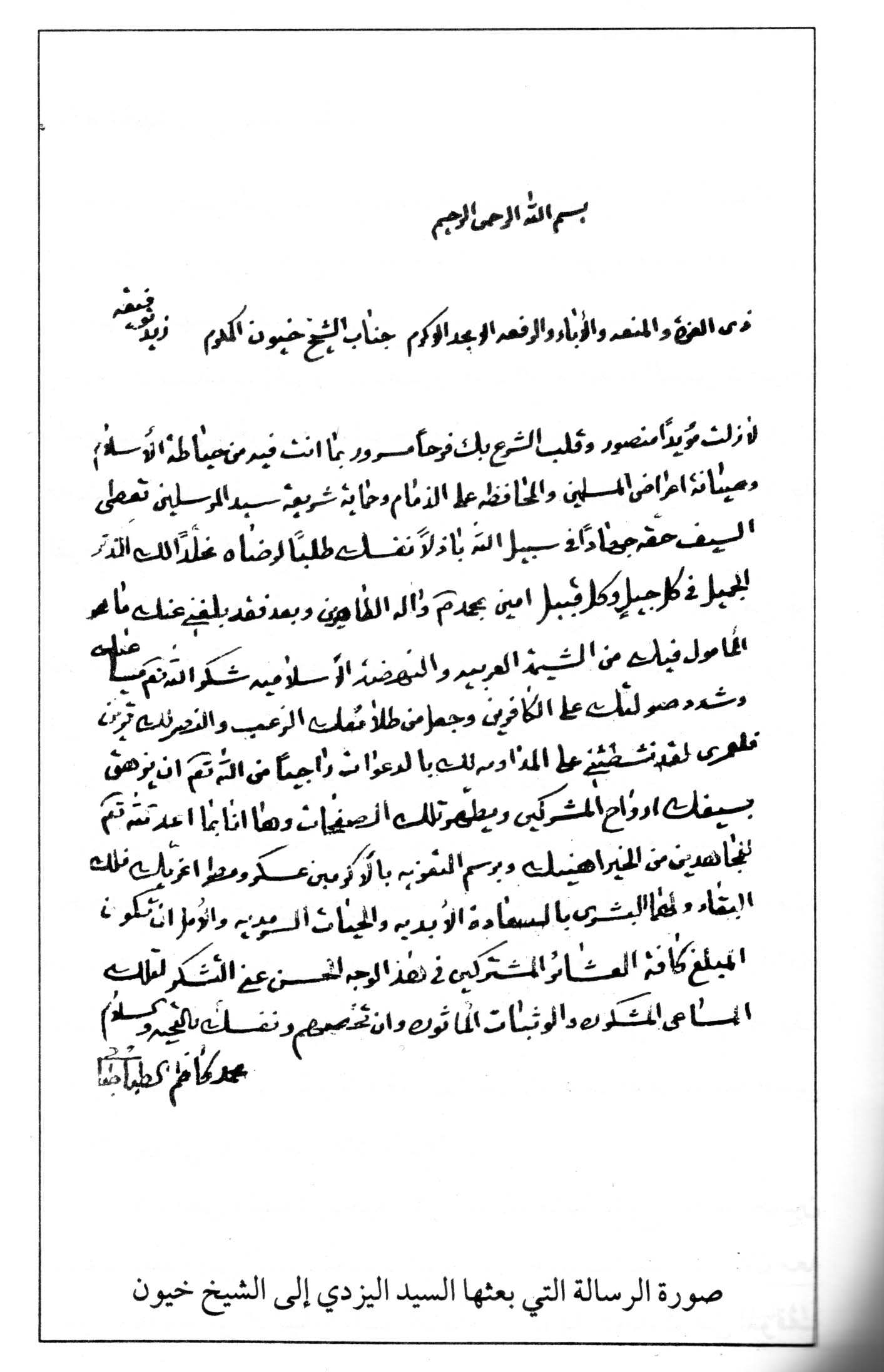 [رسالة السيد محمد كاظم الطباطبائي الى الشيخ خيون لنصرة الثورة العراقية ضد البريطانيين]