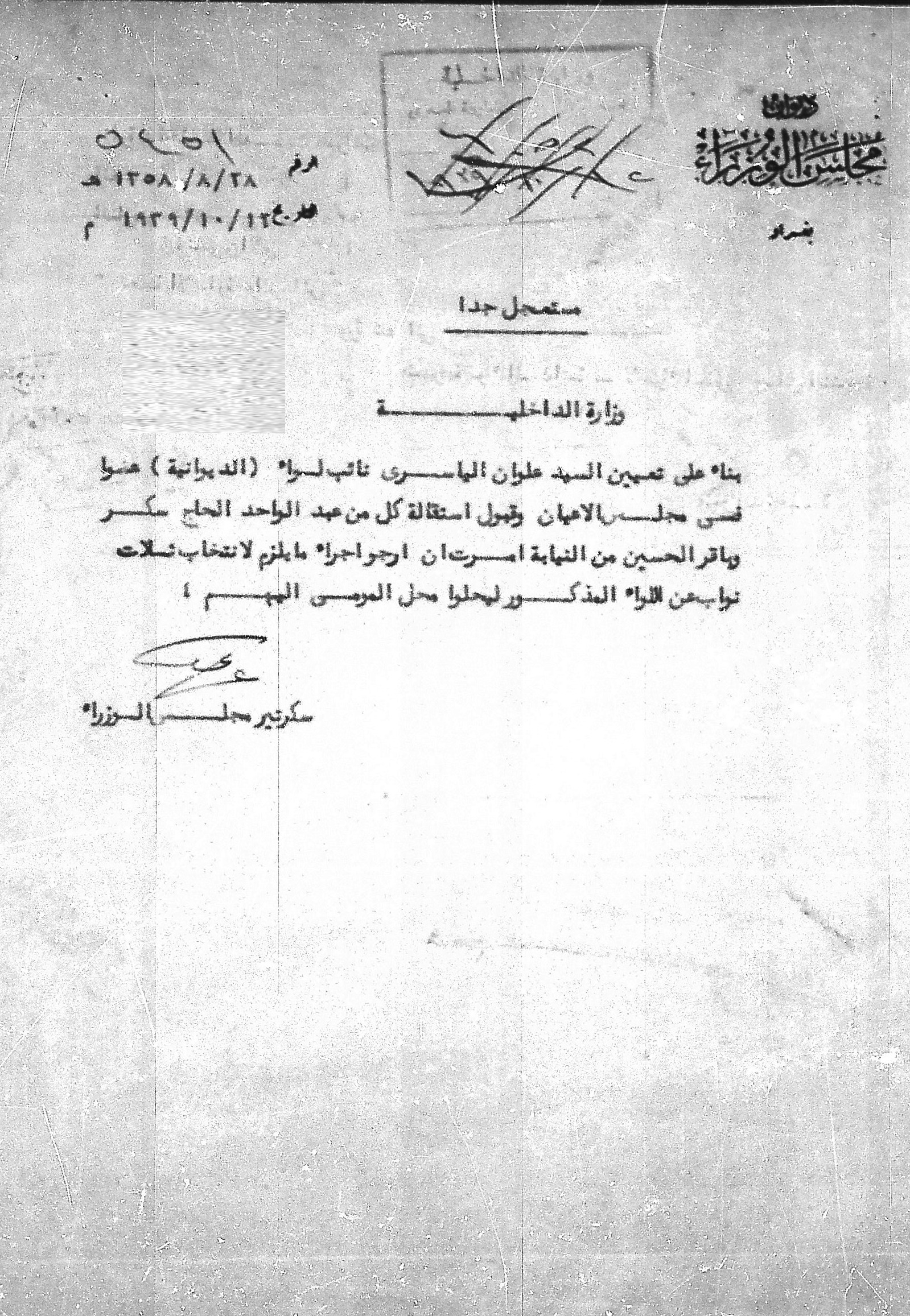تعيين السيد علوان الياسري نائب لواء الديوانية في مجلس الاعيان وقبول استقالة كل من عبد الواحد الحاج سكر وباقر الحسيني من النيابة.