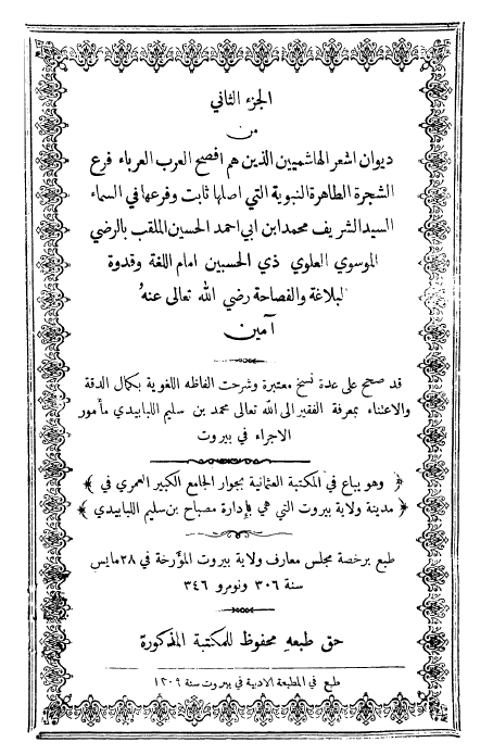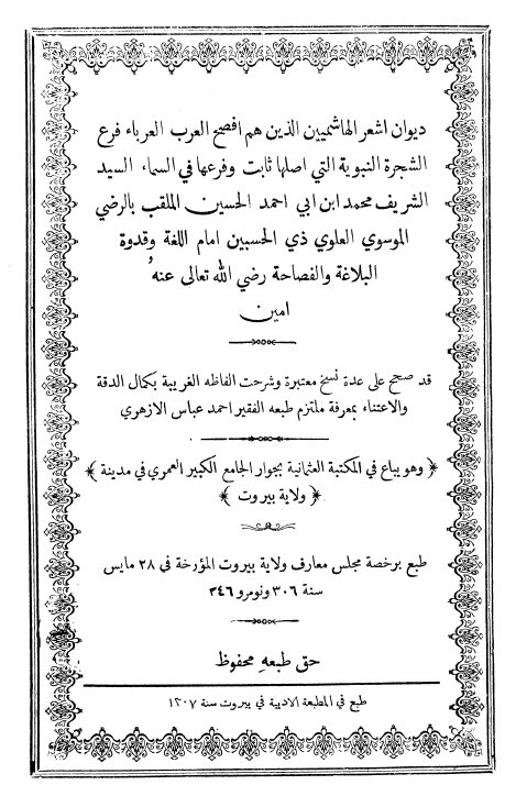 $aديوان اشعر الهاشميين الذين هم افصح العرب العرباء فرع الشجرة النبوية التي اصلها ثابت وفرعها في السماء السيد الشريف محمد ابن ابي احمد الحسين الملقب بالرضي الموسوي العلوي ذي الحسبين امام اللغة وقدوة البلاغة والفصاحة / $cقد صحح على عدة نسخ معتبرة وشرحت الفاظه الغريبة بكمال الدقة والاعتناء بمعرفة ملتزم الطبعه الفقير احمد عباس الازهري، محمد بن سليم اللبابيدي.