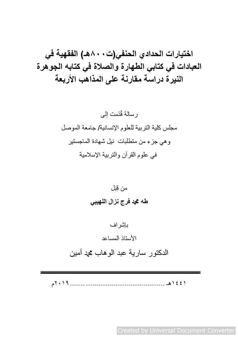 $aاختيارات الحدادي الحنفي (ت 800 هـ) الفقهية في العبادات في كتابي الطهارة والصلاة في كتابه الجوهرة النيرة : $bدراسة مقارنة على المذاهب الاربعة = Choices of ALhadadi AL-hanafi (800A.H) the jurisprudence in the worships in book Al-Tahara and the paryer in his book AL- jawhara AL-Naira Acontrastive Jursprudent : study among the four Doctrines / $cمن قبل طه محمد فرج نزال اللهيبي ؛ باشراف الاستاذ المساعد الدكتور سارية عبد الوهاب محمد امين.