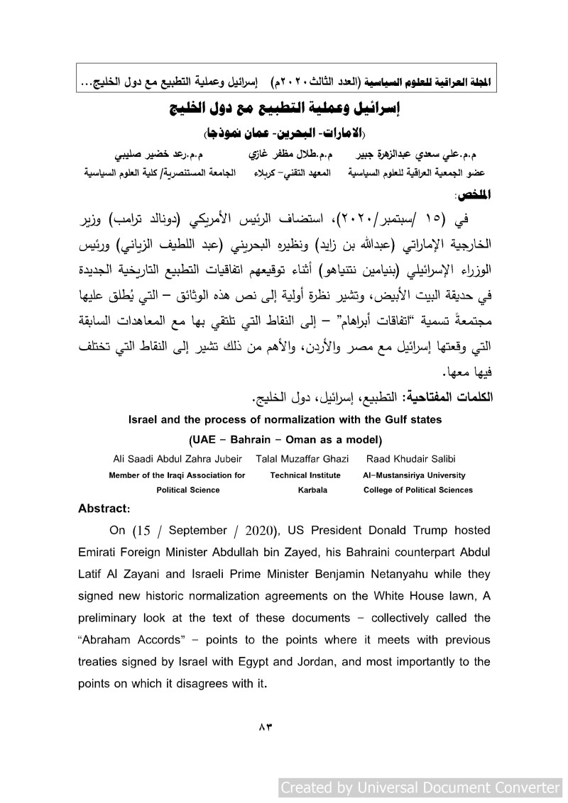 $aإسرائيل وعملية التطبيع مع دول الخليج : $bالامارات - البحرين - عمان نموذجا = Israel and the process of normalization with the Gulf states (UAE - Bahrain Oman as a model) / $cم. م. علي سعدي عبد الزهرة جبير، م. م. طلال مظفر غازي، م .م . رعد خضير صليبي.