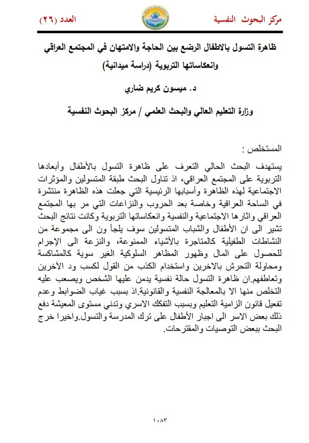$aظاهرة التسول بالاطفال الرضع بين الحاجة والامتهان في المجتمع العراقي وانعكاساتها التربوية : $bدراسة ميدانية = The phenomenon of begging infants between the need and abuse in Iraqi society and its educational implications : A field study / $cد. ميسون كريم ضاري.