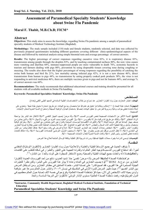 Assessment of Paramedical Specialty Students' Knowledge about Swine Flu Pandemic /