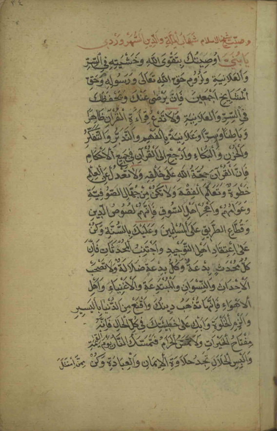 اوله : يابني اوصيك بتقوى الله تعالى وخشيته ولزوم حق الله تعالى وحق رسول الله صلى الله تعالى عليه وسلم وحق والديك وحق المشايخ اجمعين...