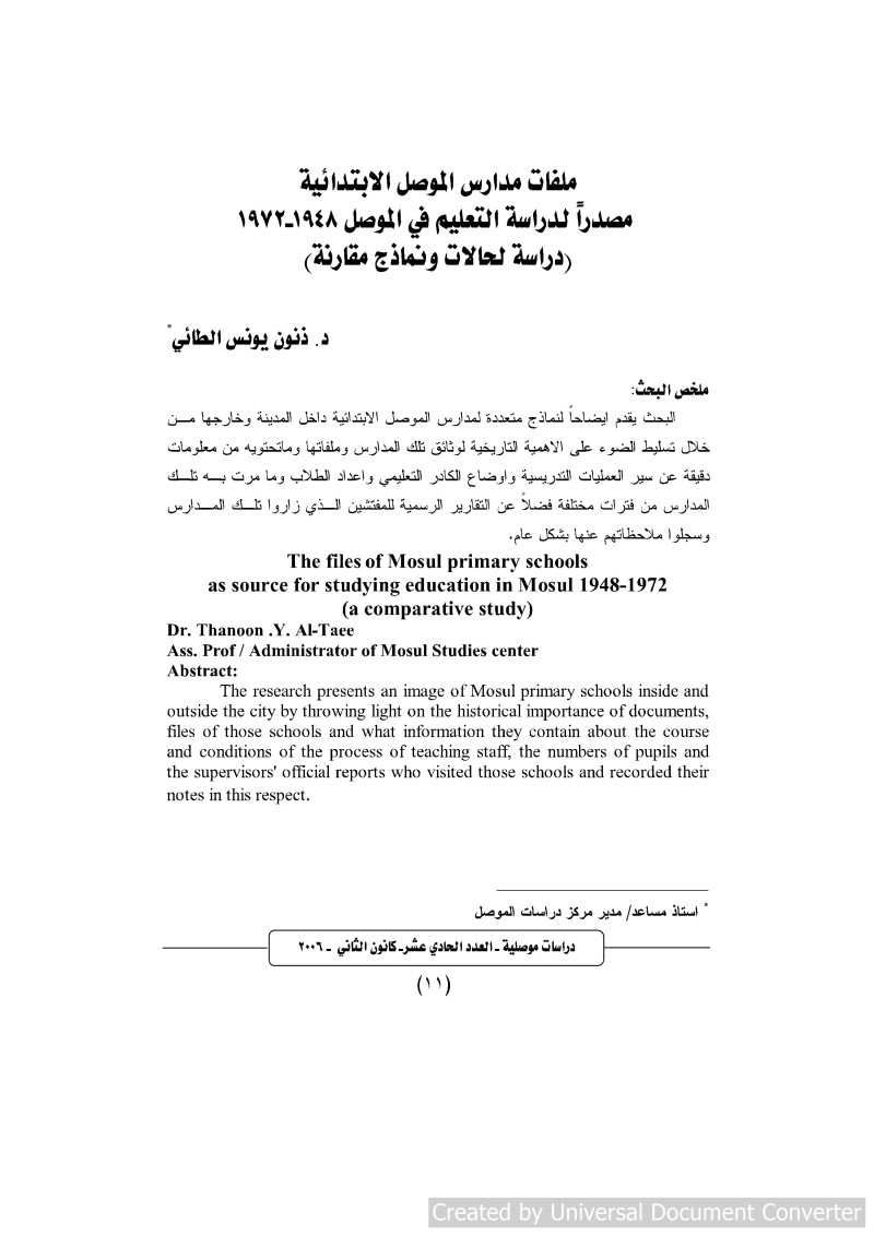 $aملفات مدارس الموصل الابتدائية مصدرا لدراسة التعليم في الموصل ١٩٤٨-١٩٧٢ : $bدراسة لحالات ونماذج مقارنة = The files of Mosul primary schools as source for studying education in Mosul 1948-1972 : a comparative study / $cد. ذنون يونس الطائي.