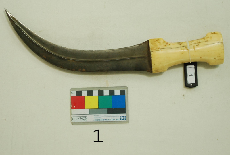 خنجر من الطراز الفارسي مصنوع من الحديد والعاج النصل مصنوع من حديد الجوهر والمقبض مغلف بالعاج منحني ذو حدين يتوسطه بروز عمودي.