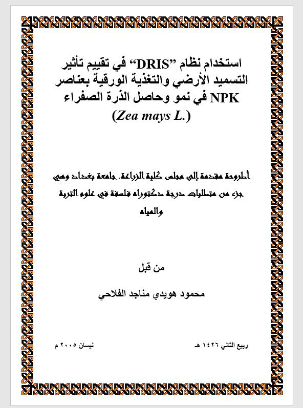 استخدام نظام “DRIS” في تقييم تاثير التسميد الارضي والتغذية الورقية بعناصر NPK في نمو وحاصل الذرة الصفراء (.Zea mays L) /