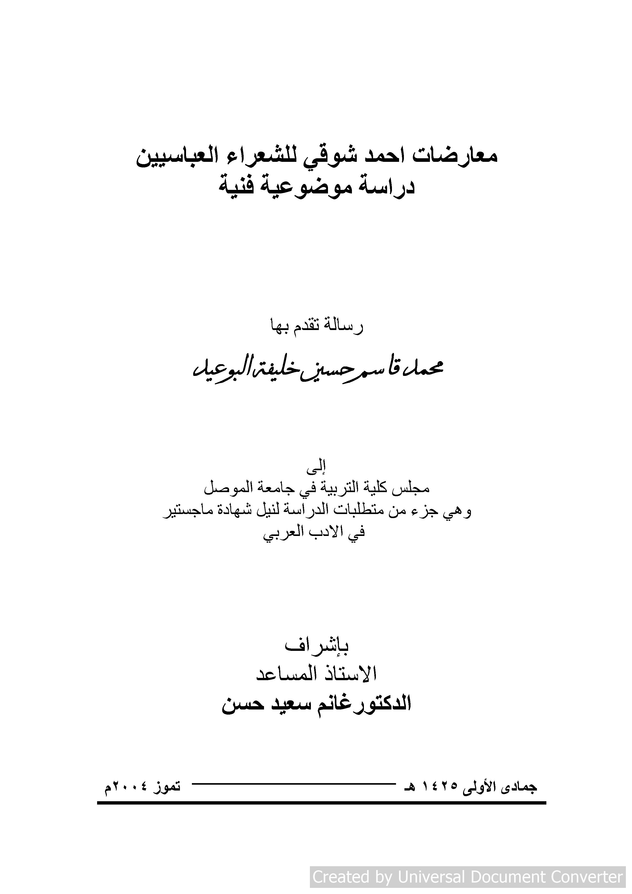 The Poetic Opposition Of Ahmed Shawqi To The Abbasi Poets : An Opjective Techical Study