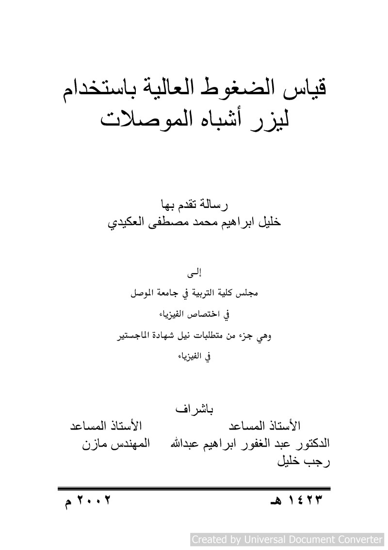 $aقياس الضغوط العالية باستخدام ليزر أشباه الموصلات = $bHigh Pressure Sensor by using semiconductor laser / $cتقدم بها خليل ابراهيم محمد مصطفى العكيدي ؛ باشراف الأستاذ المساعد الدكتور عبد الغفور ابراهيم عبد الله، المهندس مازن رجب خليل.