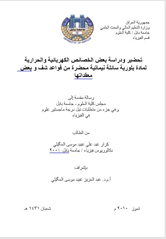 $aتحضير ودراسة بعض الخصائص الكهربائية والحرارية لمادة بلورية سائلة نيماتية محضرة من قواعد شف و بعض معقداتها = $bPreparation and Study Some of Electrical and Thermal Properties of a Nematic Liquid Crystal Material Prepared from Schiff Bases and Some its Complexes / $cمن الطالب كرار عبد علي عبيد موسى العگيلي ؛ بإشراف أ.م.د. عبد العزيز عبيد موسى العگيلي.