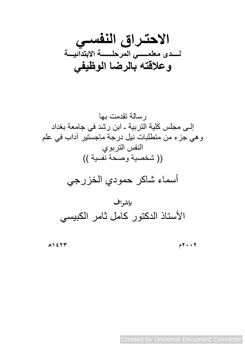 $aالاحتراق النفسي لدى معلمي المرحلة الابتدائية وعلاقته بالرضا الوظيفي = $bPsychological Burnout and Its Relation With Functional Confidence Among Primary School Teachers / $cرسالة تقدمت بها أسماء شاكر حمودي الخزرجي ؛ بإشراف الأستاذ الدكتور كامل ثامر الكبيسي.