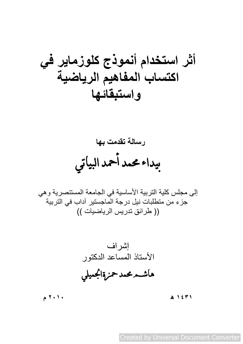 $aأثر استخدام أنموذج كلوزماير في اكتساب المفاهيم الرياضية واستبقائها = $bThe Effect of using Klausmeier's Model to Acquisition and Retention of Mathematical Concepts / $cرسالة تقدمت بها بيداء محمد أحمد البياتي ؛ إشراف الأستاذ المساعد الدكتور هاشم محمد حمزة الجميلي.