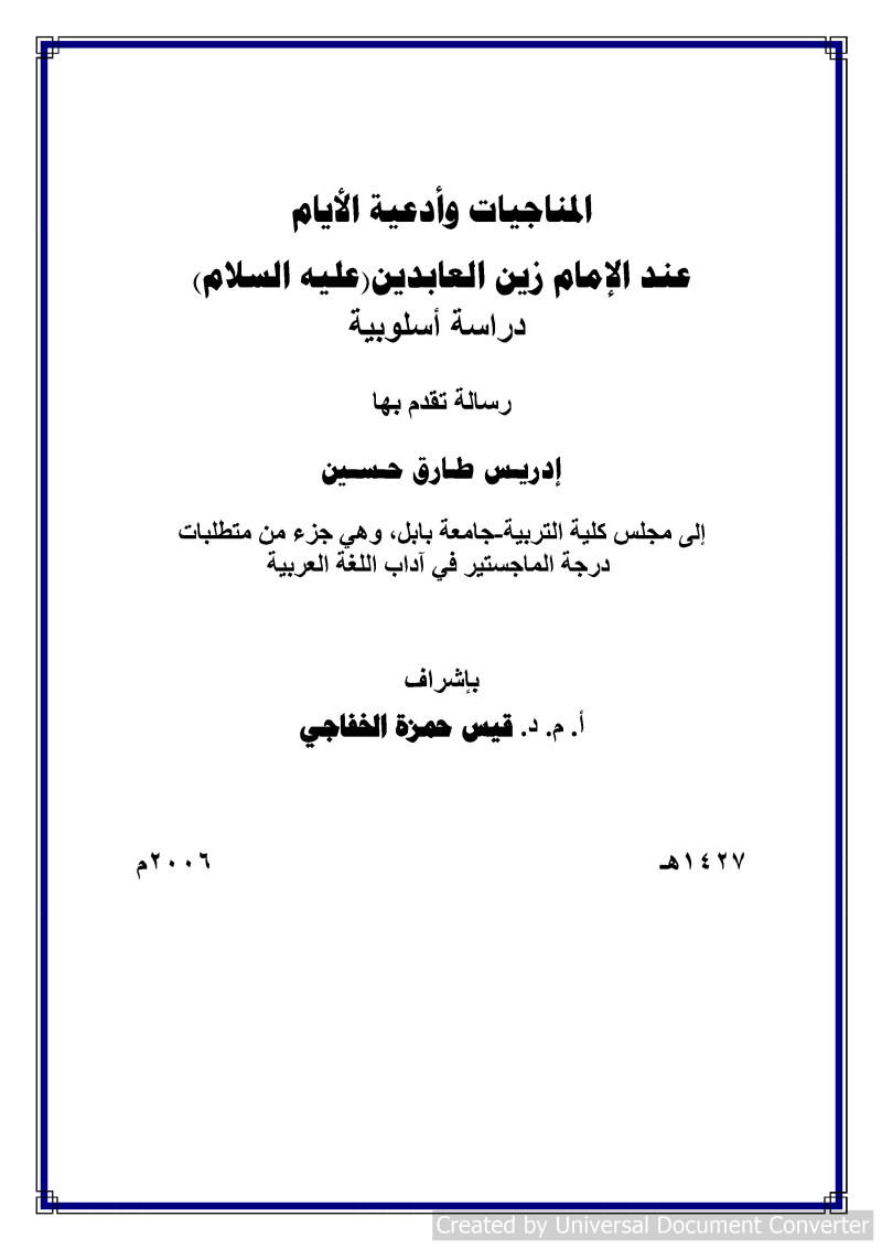 $aالمناجيات وأدعية الأيام عند الإمام زين العابدين (عليه السلام) : $bدراسة أسلوبية = Soliloquies and supplication of days of Imam Zain Al – Abedin (peace be upon him) : Stylistic Study / $cرسالة تقدم بها إدريس طارق حسين ؛ إشراف أ. م. د. قيس حمزة الخفاجي.