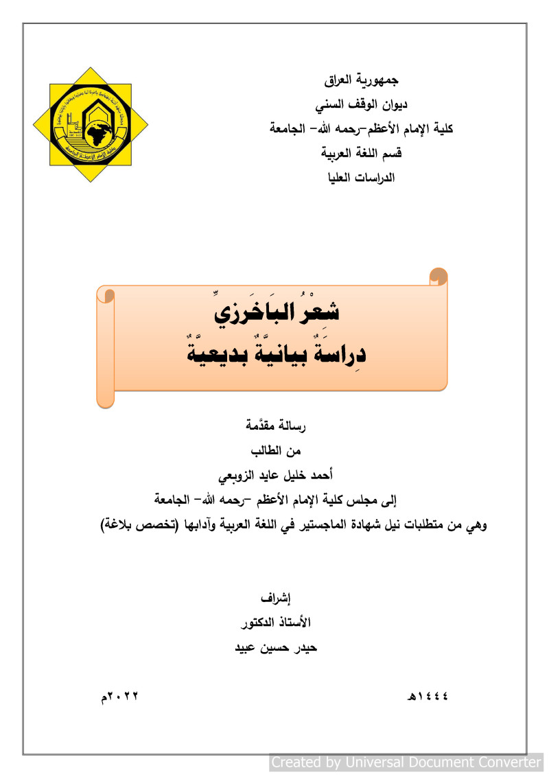 $aكلية الامام الاعظم الجامعة (بغداد، العراق). $bقسم اللغة العربية، $eالمؤسسة المانحة للدرجة.