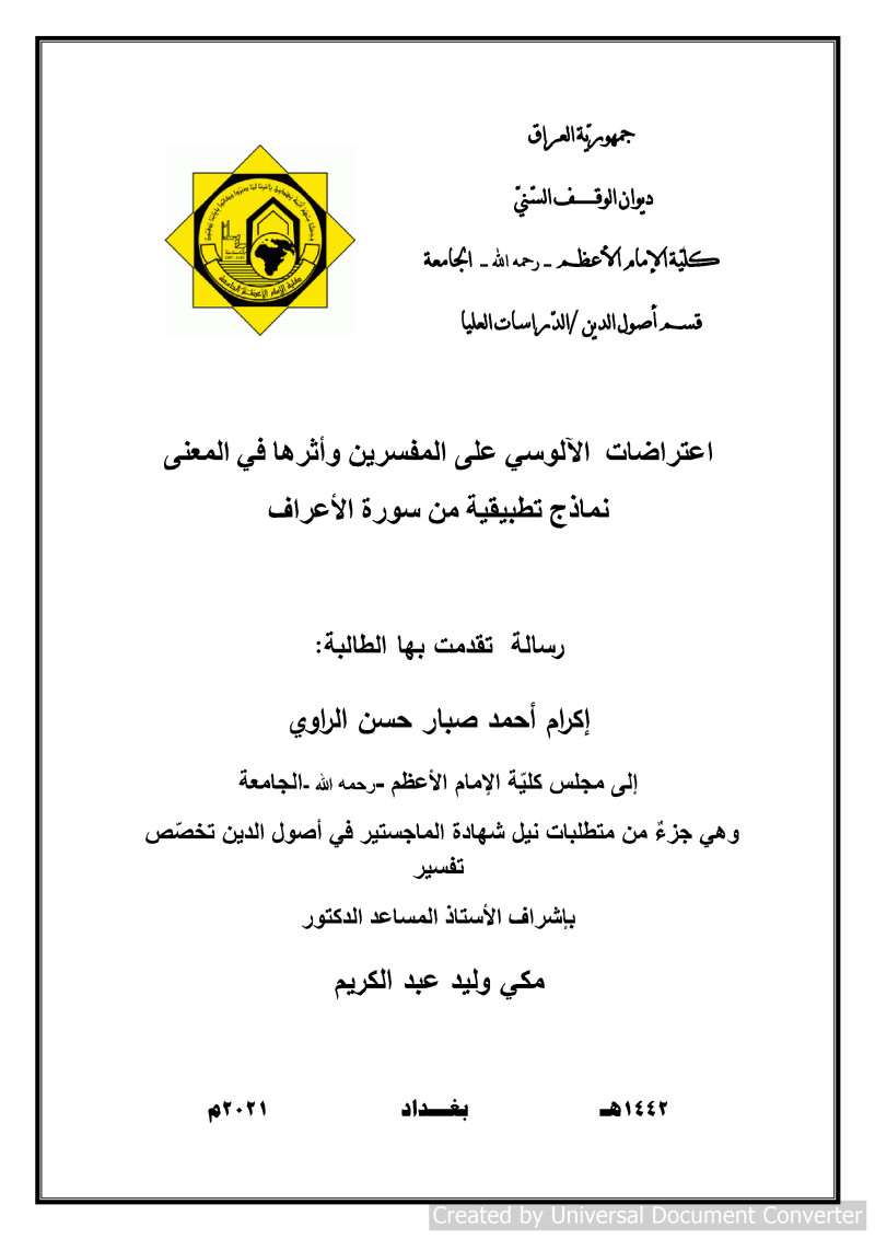 $aاعتراضات الآلوسي على المفسرين وأثرها في المعنى : $bنماذج تطبيقية من سورة الأعراف = Al_ Alusi objections to interpreters and their impact on the meaning in AL-Aaraf Surat / $cرسالة تقدمت بها الطالبة إكرام أحمد صبار حسن الراوي ؛ بإشراف الأستاذ المساعد الدكتور مكي وليد عبد الكريم.