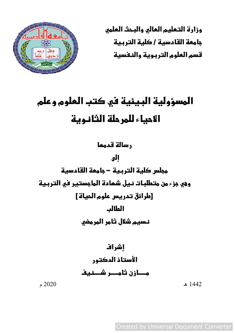 $aالمسؤولية البيئية في كتب العلوم وعلم الاحياء للمرحلة الثانوية = $bEnvironmental responsibility in sciences and biology textbooks for the secondary stage / $cنسيم شلال ثامر المرمضي ؛ إشراف الأستاذ الدكتور مازن ثامر شنيف.