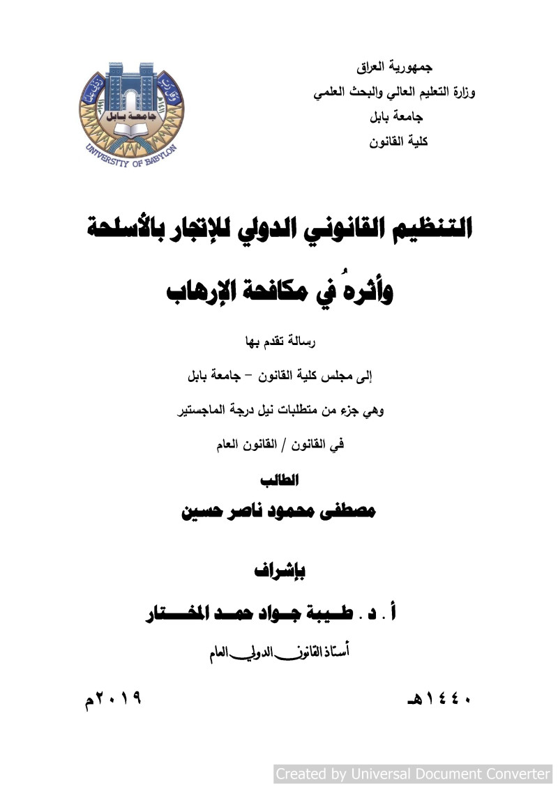 $aالتنظيم القانوني الدولي للاتجار بالاسلحة واثره في مكافحة الارهاب = $bInternational legal regulation of arms trafficking and its impact on combating terrorism / $cالطالب مصطفى محمود ناصر حسين ؛ باشراف أ.د. طيبة جواد حمد المختار.