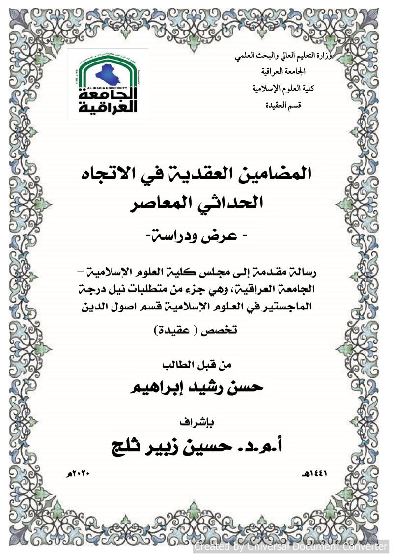 $aالجامعة العراقية (بغداد، العراق). $bكلية العلوم الاسلامية. $bقسم العقيدة والفكر الاسلامي، $eالمؤسسة المانحة للدرجة.