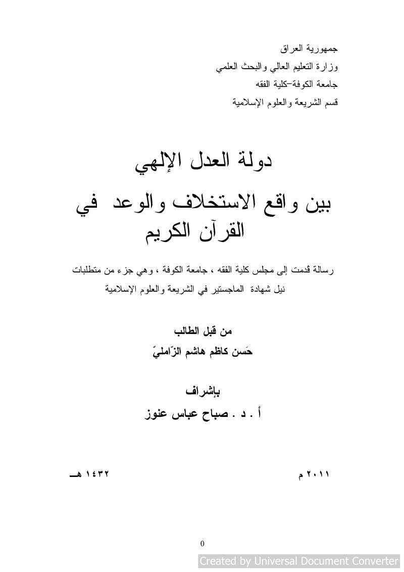 $aدولة العدل الالهي بين واقع الاستخلاف والوعد في القرآن الكريم = $bThe State of Divine Justice Between Succession & Promise in the Holy Quran / $cحسن كاظم هاشم الزاملي ؛ باشراف أ. د. صباح عباس عنوز.