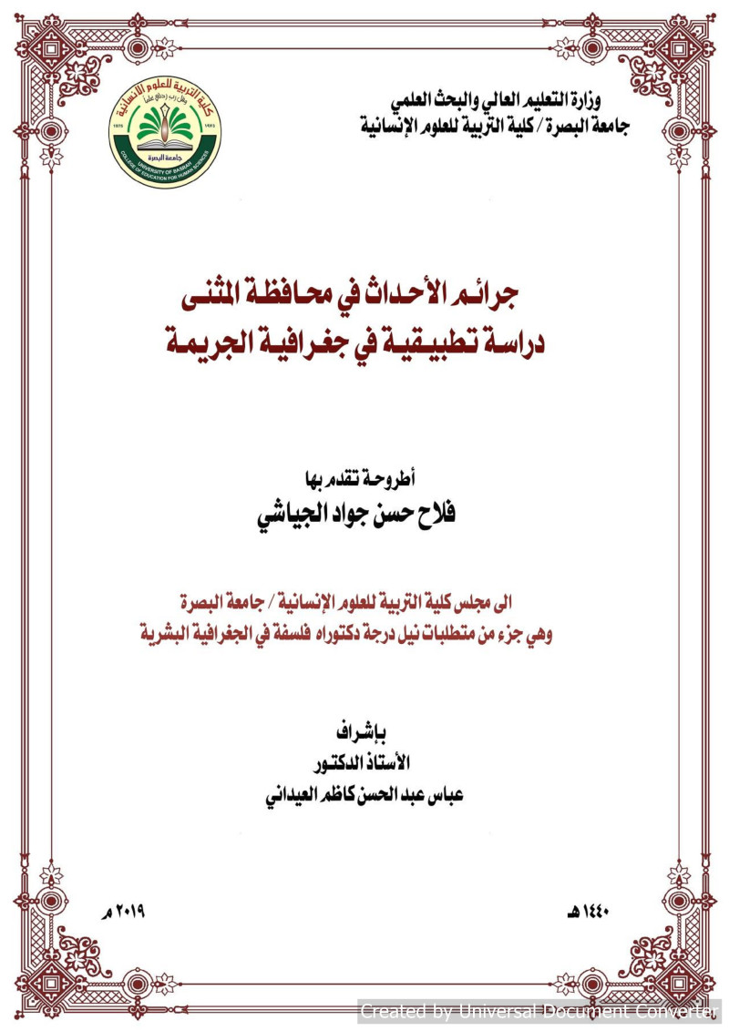 $aجرائم الاحداث في محافظة المثنى : $bدراسة تطبيقية في جغرافية الجريمة = $bTeenagers' Crimes in Al-Muthanna Governorate : An Applied Study in the Geography of Crime / $cفلاح حسن جواد الجياشي ؛ باشراف الاستاذ الدكتور عباس عبد الحسن كاظم العيداني.