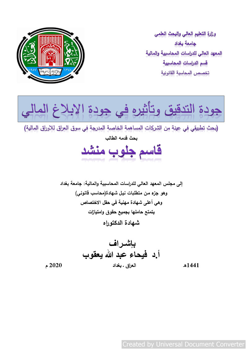 $aAudit Quality and Its Impact In The Quality Of Financial Reporting : $b(Applied Research for Sample Of Private Joint Stock Companies Listed On The Iraq Stock Exchange)