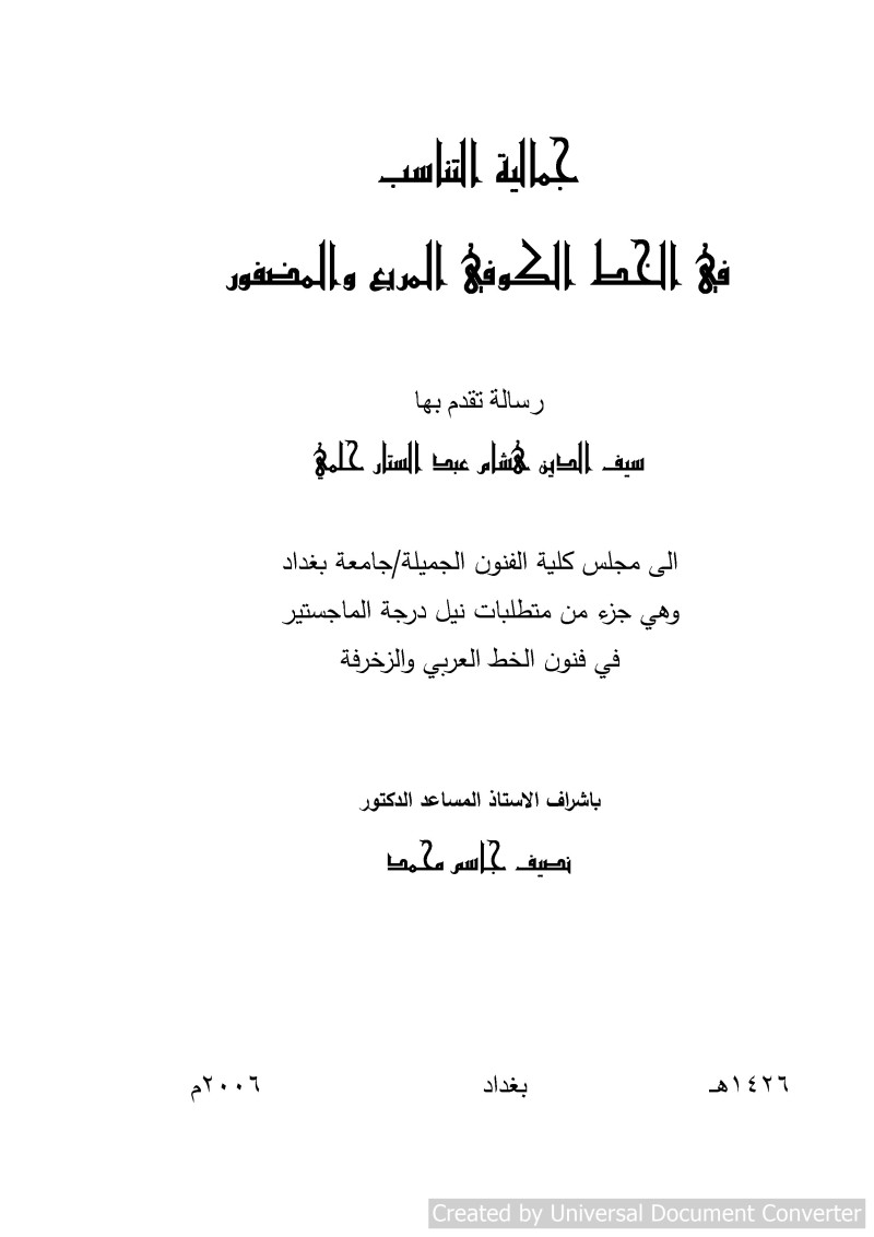 $aجمالية التناسب في الخط الكوفي المربع والمضفور = $bAestheticism of proportion in square and plaited kufic calligraphy / $cتقدم بها سيف الدين هشام عبد الستار حلمي ؛ باشراف الاستاذ المساعد الدكتور نصيف جاسم محمد.