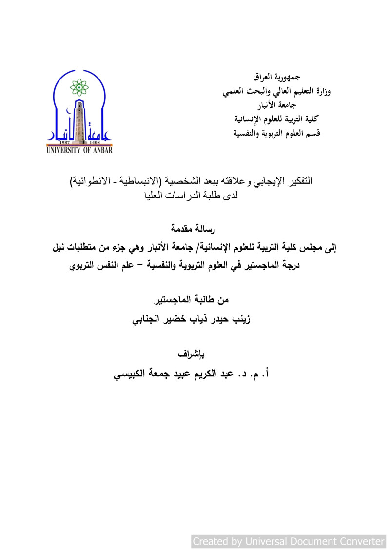 $aالتفكير الايجابي وعلاقته ببعد الشخصية : $b(الانبساطية-الانطوائية) لدى طلبة الدراسات العليا = Positive thinking and its relation to the : (Extravert- Introvert) pe rsonal dimension of the postgraduate students / $cزينب حيدر ذياب خضير الجنابي ؛ باشراف أ. م. د. عبد الكريم عبيد جمعة الكبيسي.