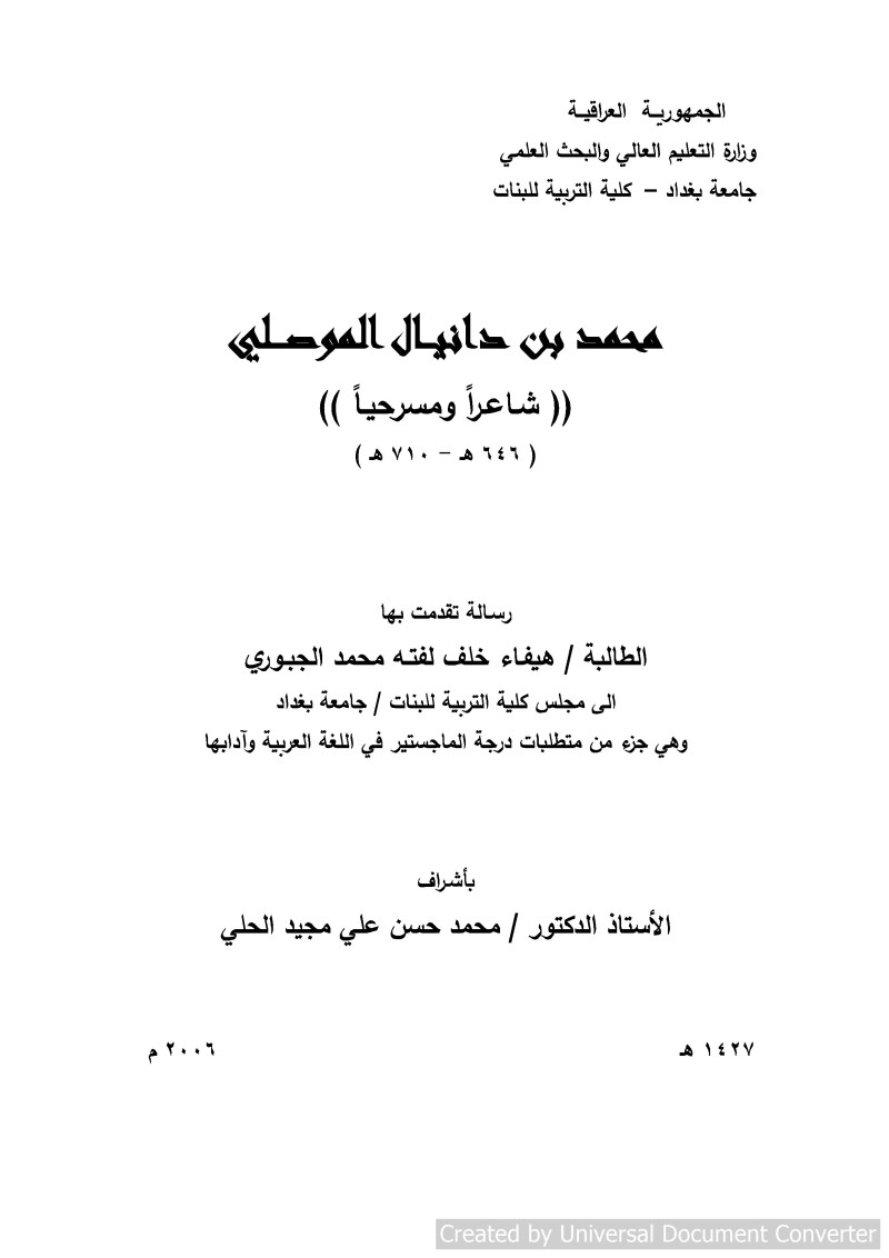 $aمحمد بن دانيال الموصلي : $bشاعرا ومسرحيا 646 هـ - 710 هـ / $cهيفاء خلف لفته محمد الجبوري ؛ اشراف محمد حسن علي مجيد الحلي.