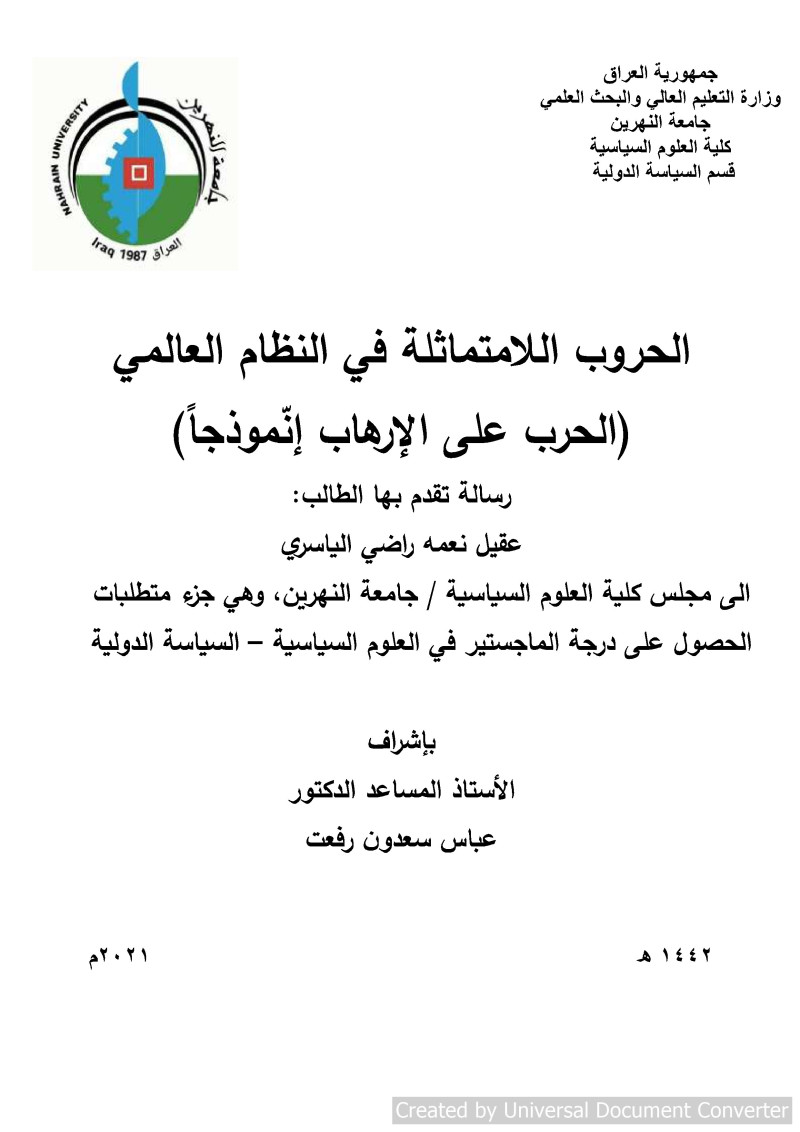 $aالحروب اللامتماثلة في النظام العالمي : $bالحرب على الإرهاب إنموذجًا = Asymmetric wars in the world system :The war on terror as a model / $cعقيل نعمه راضي الياسري ؛ بإشراف الأستاذ المساعد الدكتور عباس سعدون رفعت.