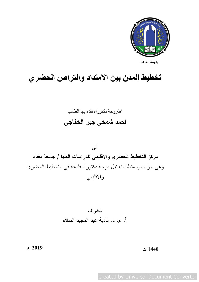 $aتخطيط المدن بين الامتداد والتراص الحضري = $bCities Planning Between Urban Sprawl and Urban Compactness / $cاحمد شمخي جبر الخفاجي ؛ اشراف أ. م. د. نادية عبد المجيد السلام.
