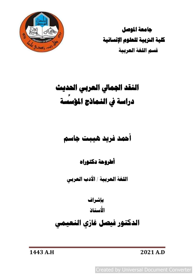 $aالنقد الجمالي العربي الحديث : $bدراسة في النماذج المؤسسة = Modern Arab Aesthetic Criticism : A Study for the foundation texts / $cأحمد فريد هيبت جاسم ؛ بإشراف الأستاذ الدكتور فيصل غازي النعيمي.