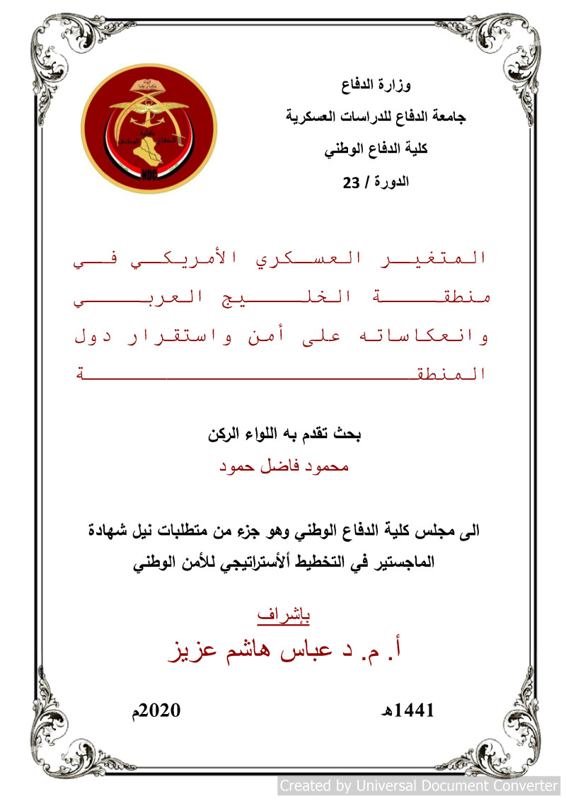 $aجامعة الدفاع للدراسات العسكرية (بغداد، العراق). $bكلية الدفاع الوطني، $eالمؤسسة المانحة للدرجة.