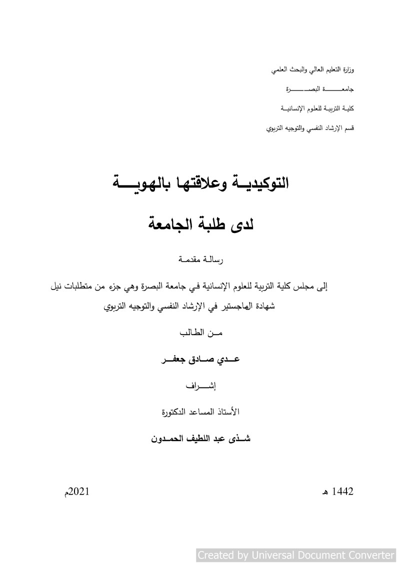 $aجامعة بغداد (العراق). $bكلية التربية للعلوم الانسانية. $bقسم الارشاد النفسي والتوجيه التربوي، $eالمؤسسة المانحة للدرجة.