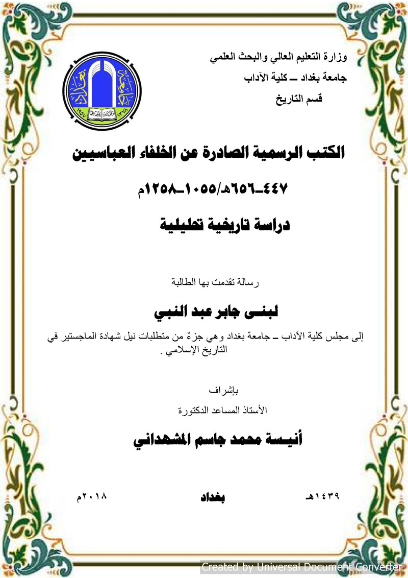 $aالكتب الرسمية الصادرة عن الخلفاء العباسيين 447 - 656 هـ / 1055 - 1258 م : $bدراسة تاريخية تحليلية = OFFICIAL WRITINGS DOCUMENTS ISSUED BY ABBASSID CALIPHATES FROM (447-656 HIJRA, 1258 C.E) : A HISTORICAL ANALYTICAL STUDY / $cرسالة تقدمت بها الطالبة لبنى جابر عبد النبي ؛ باشراف الاستاذ المساعد الدكتورة انيسة محمد جاسم المشهداني.