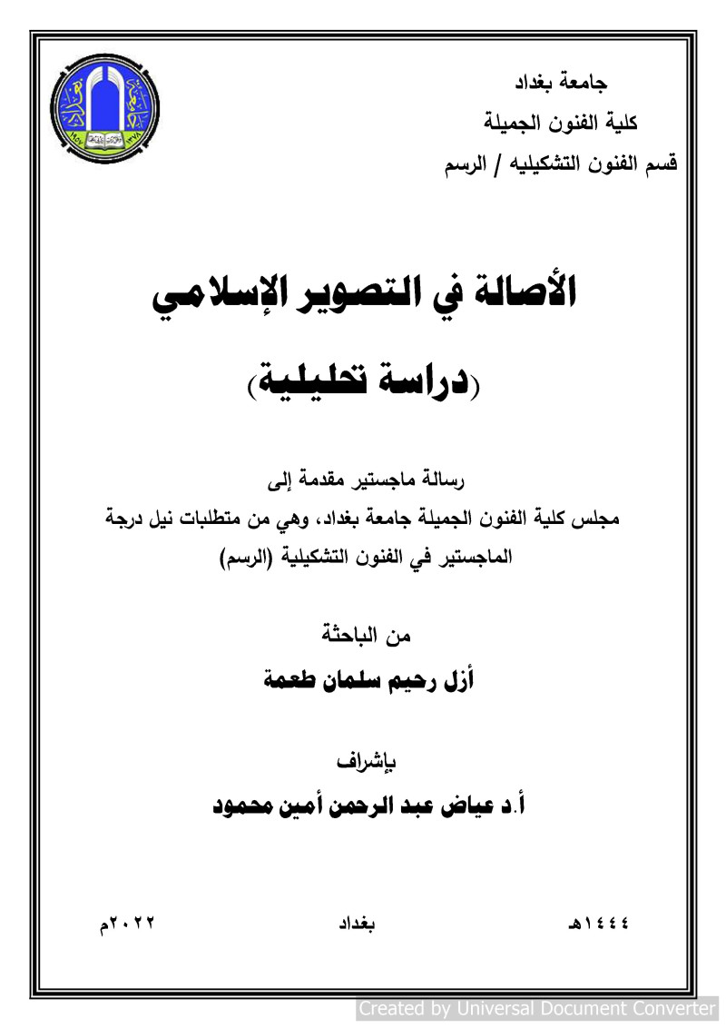 $aالأصالة في التصوير الإسلامي : دراسة تحليلية = Authenticity in Islamic photography : An analytical study / $cأزل رحيم سلمان طعمة ؛ بإشراف أ.د عياض عبد الرحمن أمين محمود.