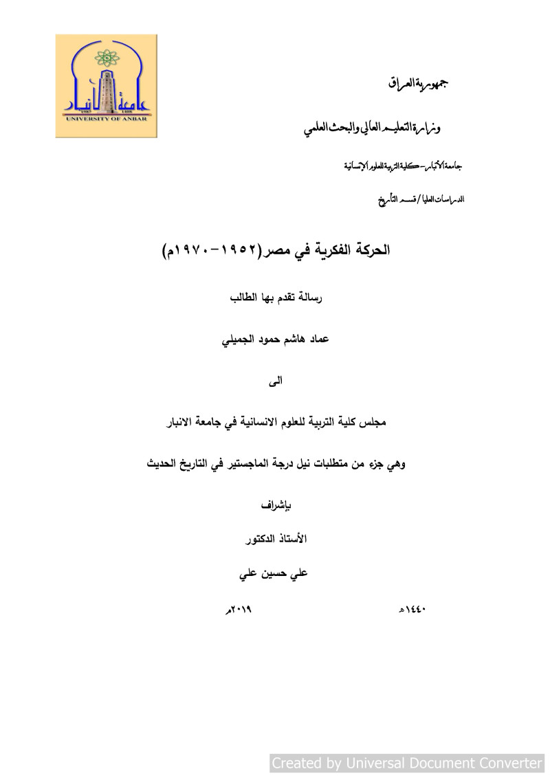 $aالحركة الفكرية في مصر (1952 - 1970م) = $bThe Intellectual Movement in Egypt (1952-1970) A.D / $cتقدم بها الطالب عماد هاشم حمود الجميلي ؛ باشراف الاستاذ الدكتور علي حسين علي.