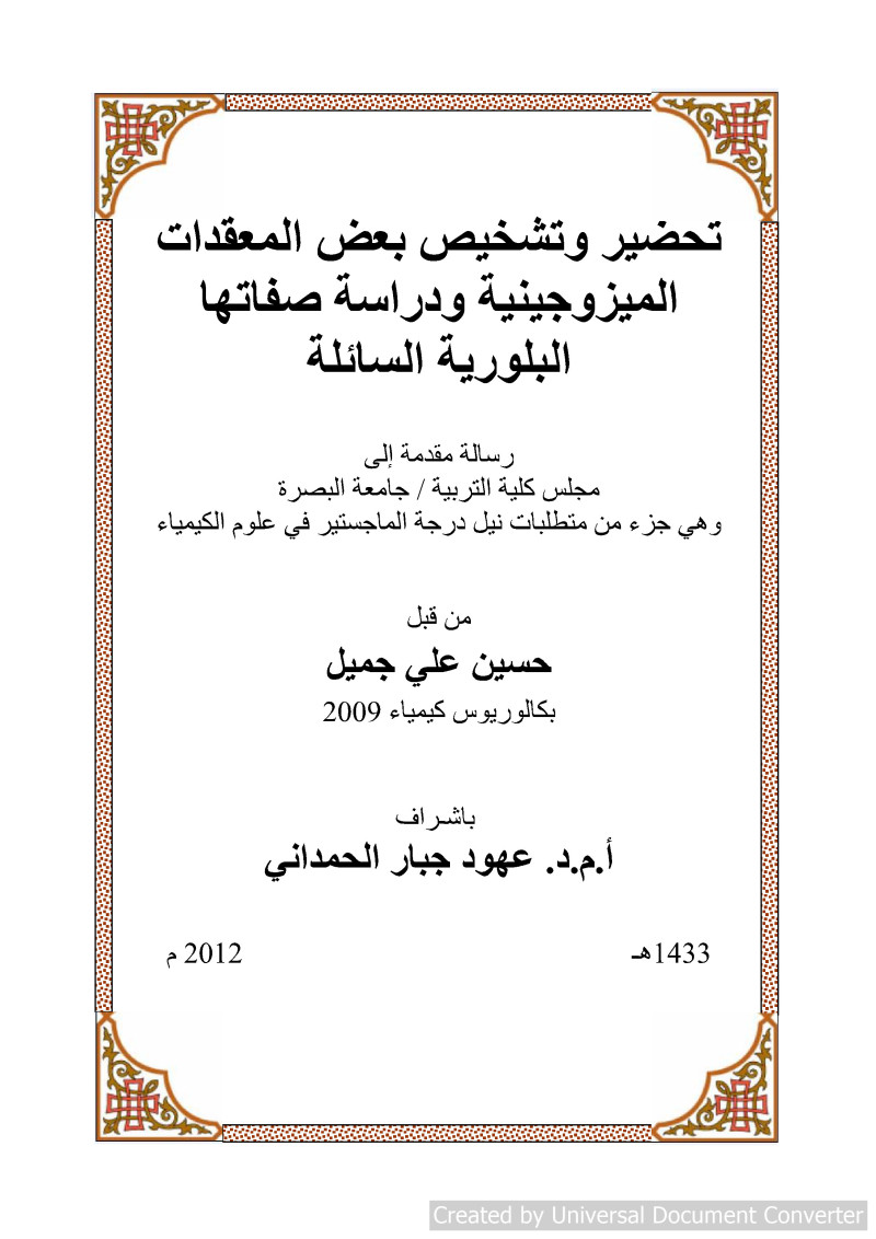 $aتحضير وتشخيص بعض المعقدات الميزوجينية ودراسة صفاتها البلورية السائلة = $bSynthesis and Characterization of Some Metallomesogens and Study their Mesomorphic Properties / $cحسين علي جميل.