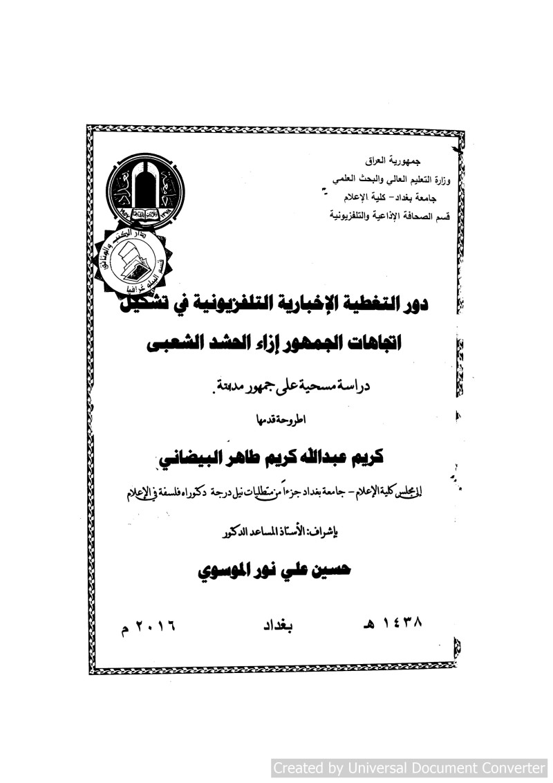 $aدور التغطية الاخبارية التلفزيونية في تشكيل اتجاهات الجمهور ازاء الحشد الشعبي : $bدراسة مسحية على جمهور مدينة بغداد = The role of television news coverage in shaping public attitudes about the popular crowd : A survey on the audience the city of Baghdad / $cقدمها كريم عبد الله كريم طاهر البيضاني ؛ بإشراف الأستاذ المساعد الدكتور حسين علي نور الموسوي.