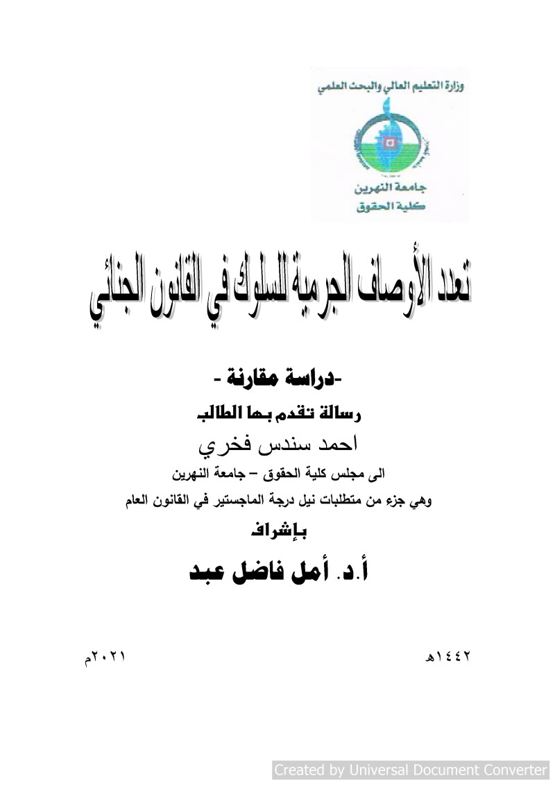 $aتعدد الأوصاف الجرمية للسلوك في القانون الجنائي : $bدراسة مقارنة = Multiple Criminal Descriptions of Behavior In Criminal Law / $cرسالة تقدم بها الطالب احمد سندس فخري ؛ بإشراف أ.د. أمل فاضل عبد.