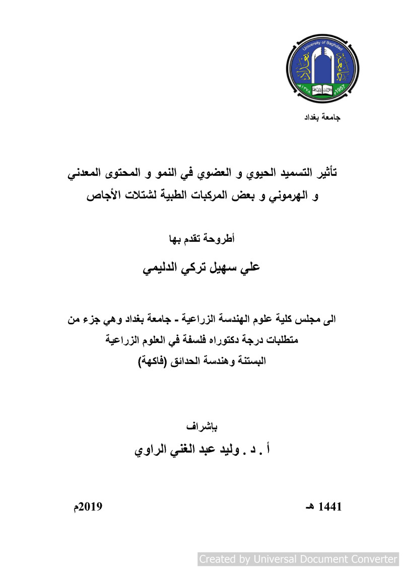$aتأثير التسميد الحيوي والعضوي في النمو والمحتوى المعدني والهرموني وبعض المركبات الطبية لشتلات الأجاص = $bEffect of Bio and Organic Fertilizers in Growth, Mineral, Hormonal and Some Medical Compounds Content of Plum Transplants / $cتقدم بها علي سهيل تركي الدليمي ؛ بإشراف أ . د . وليد عبد الغني الراوي.