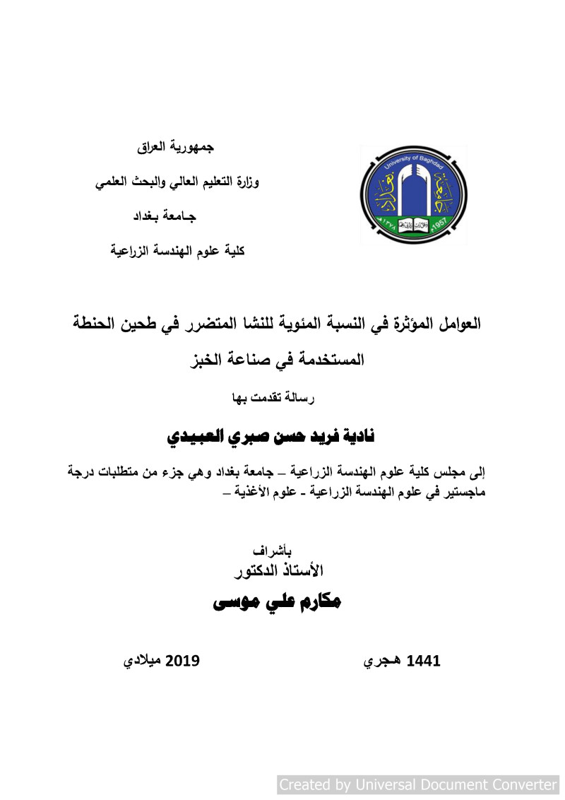 $aالعوامل المؤثرة في النسبة المئوية للنشا المتضرر في طحين الحنطة المستخدمة في صناعة الخبز = $bFactors influence on damage starch ratio in wheat flour used in bread making / $cنادية فريد حسن صبري العبيدي ؛ بإشراف الاستاذ الدكتور مكارم علي موسى.