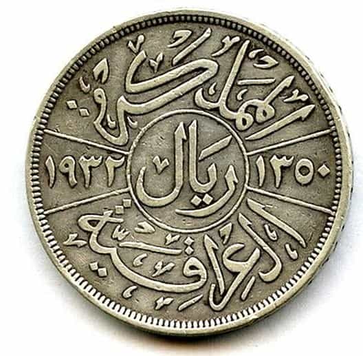 عملة معدنية فضية قيمتها 1 ريال تعود لزمن الملك فيصل الاول 1932، منقوش عليها المملكة العراقية ريال 1350 1932، وعلى الجانب الآخر صورة لرأس الملك فيصل الاول مع عبارة فيصل الاول ملك العراق.